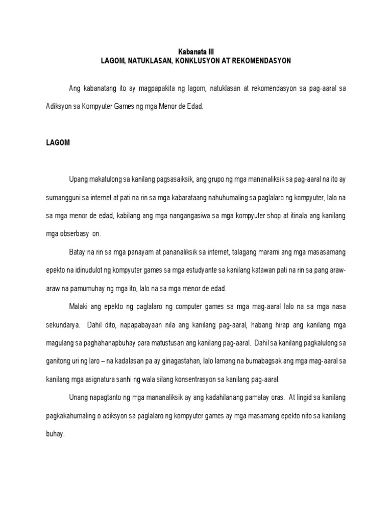 Kabanata V Lagom Konklusyon at Rekomendasyon Ang kabanatang ito ay naglalaman ng binalangkas na lagom konklusyon mula sa. 1532014 THESIS Pananaliksik Tagalog 1. View chapter-5-page-numberdocx from ECE MISC at De La Salle Philippines.